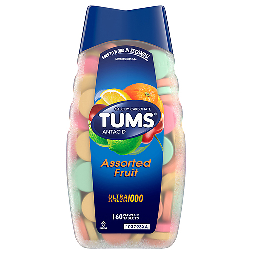 TUMS Ultra Strength Chewable Antacid Tablets go to work in seconds by starting to neutralize acid on contact to bring fast and powerful ultra strength heartburn relief, with 33 percent more acid fighting power per tablet (compared to Extra Strength TUMS). When symptoms occur, chew and swallow two to three ultra strength tablets, depending on the severity of your acid indigestion. Featuring the active ingredient calcium carbonate, these chewable antacids relieve heartburn, sour stomach, acid indigestion and provide upset stomach relief associated with these symptoms. Delicious and fast, these TUMS Assorted Fruit antacid tablets include a variety of tasty flavors. TUMS antacid tablets are the #1 recommended adult antacid brand by doctors, pharmacists and OBGYNs. As America's #1 antacid and trusted as a heartburn medicine for 90 years, TUMS is fully supported with a satisfaction guarantee. These ultra strength antacid tablets are packaged in a resealable bottle that's convenient to keep in your car or office for whenever heartburn strikes. Choose these 1000 mg antacid tablets to fight flare ups fast, at home or on the go.
