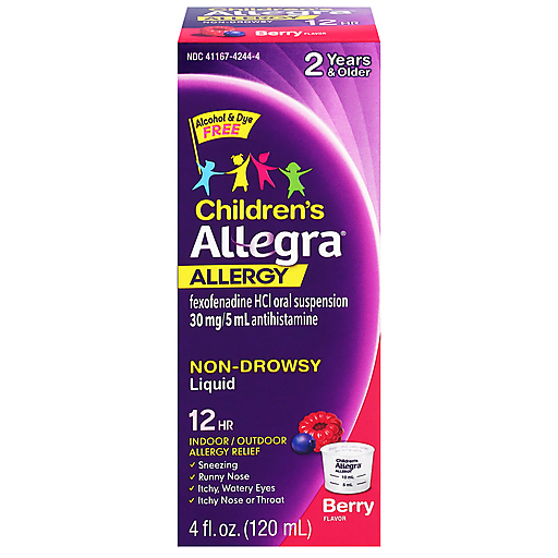 Kid allergies are unpleasant, but taking children's allergy medicine doesn't have to be. Alleviate your child's allergy symptoms with Allegra Children's 12-Hour Allergy Relief Liquid in berry flavor. Children's Allegra is for kids 2 years and older provides 12 full hours of non-drowsy relief from sneezing, runny nose, itchy and watery eyes, and itchy nose or throat. Use Allegra children's allergy medicine for indoor and outdoor allergens like pollen, ragweed, grass, trees, and pet dander. Best of all, this allergy medicine is made with active ingredient fexofenadine, an antihistamine designed to have no impact on kids' concentration, alertness, or learning ability due to drowsiness. Stock up on Allegra Children's 12-Hour Liquid for everyday relief from kids' allergy symptoms.