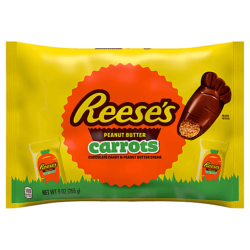 Your days just got a whole lot sweeter with REESE'S Chocolate Peanut Butter Creme Carrots candy. Whether you're filling Easter baskets or plastic eggs, there's never been a better reason to get lost in the taste of smooth peanut butter creme and chocolate candy of a REESE'S treat, now in fun carrot shapes! Each sweet in this bag provides the perfect helping of festive fun to treat the taste buds of your favorite candy lover. Light in weight but heavy on flavor, these peanut butter creme carrots are kosher certified and sure to please anyone in need of a midday pick-me-up. Remember to treat yourself too. Keep some REESE'S peanut butter creme candies on hand for your next Easter celebration. And don't stop there! If you're feeling creative in the kitchen, include REESE'S peanut butter creme treats in your Easter dessert baking plans. Try putting whole or crumbled chocolate and peanut butter creme treats on top of your best cookies, cupcakes or brownies — anyone you share with will beg for your secret recipe after just one bite. Even better, add some peanut butter creme carrots to your ice cream sundae. Just don't forget to save a few candies for yourself!
