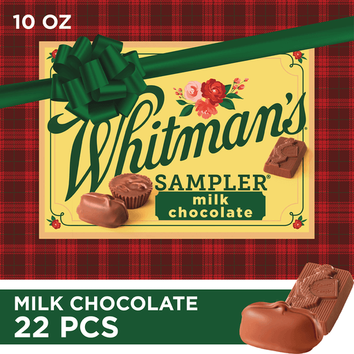 Delight friends and family this holiday season with WHITMAN'S SAMPLER Christmas Assorted Milk Chocolate Gift Box, 10 oz. This 22 piece Christmas candy assortment features 11 mouth-watering milk chocolate favorites: milk chocolate peanut cluster, milk chocolate peanut caramel, milk chocolate caramel, milk chocolate coconut crème, milk chocolate butter cream, solid milk chocolate messenger, milk chocolate chocolate nut fudge, milk chocolate vanilla crème, milk chocolate covered peanuts, milk chocolate nut caramel and milk chocolate orange crème. WHITMAN'S SAMPLER assorted chocolates are the perfect gift for every celebration or occasion! Since 1842, Americans have been making connections, and enjoying sweet, quality holiday moments with Whitman’s chocolate. We are proud to have been shared and savored by generations.